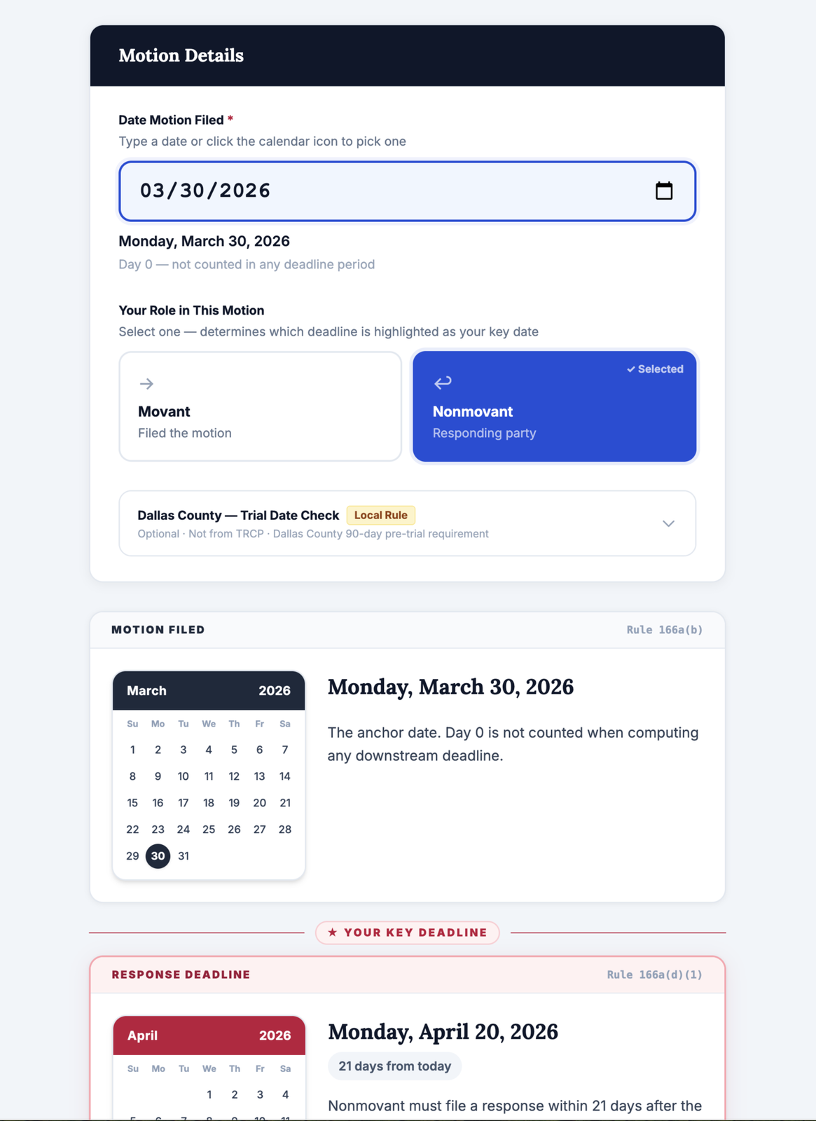 The calculator applies Texas Rule 4 to automatically roll deadlines forward when they fall on weekends or state holidays, includes a Dallas County local rule toggle for the 90-day pre-trial filing restriction, allows users to indicate whether they are the movant or nonmovant to highlight their key deadline, and generates a printable deadline schedule. The tool also provides embeddable code for attorneys or court websites who want to add the calculator to their own pages.